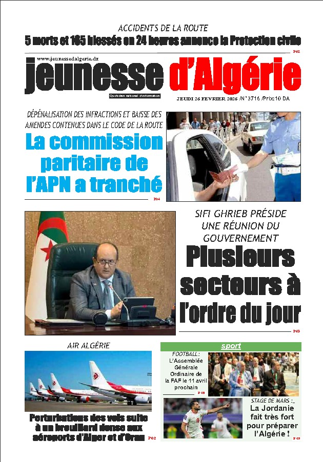 AlgérieMessage du président de la République à l’occasion de la Journée nationale du chahid AlgérieSommet de l’UA : Allocution du président de la République concernant l’étude relative aux répercussions de la qualification du colonialisme comme crime contre l’humanité AlgérieReprésentant le président de la République, le Premier ministre participe à Addis-Abeba à une séance sur le G20 AlgérieLe président de la République préside un Conseil des ministres : le secteur de l’eau et les préparatifs pour le mois sacré au menu À LA UNE Message du président de la République à l’occasion de la Journée nationale du chahid février 18, 2026 Sommet de l’UA : Allocution du président de la République concernant l’étude relative aux répercussions de la qualification du colonialisme comme crime contre l’humanité février 15, 2026 Représentant le président de la République, le Premier ministre participe à Addis-Abeba à une séance sur le G20 février 15, 2026 Le président de la République préside un Conseil des ministres : le secteur de l’eau et les préparatifs pour le mois sacré au menu février 10, 2026 Algérie Sifi Ghrieb préside une réunion du Gouvernement : plusieurs secteurs à l’ordre du jour février 25, 2026 Message du président de la République à l’occasion de la Journée nationale du chahid février 18, 2026 Sommet de l’UA : Allocution du président de la République concernant l’étude relative aux répercussions de la qualification du colonialisme comme crime contre l’humanité février 15, 2026 Représentant le président de la République, le Premier ministre participe à Addis-Abeba à une séance sur le G20 février 15, 2026 LatestPopular Sifi Ghrieb préside une réunion du Gouvernement : plusieurs secteurs à l’ordre du jour février 25, 2026 Message du président de la République à l’occasion de la Journée nationale du chahid février 18, 2026 Sommet de l’UA : Allocution du président de la République concernant l’étude relative aux répercussions de la qualification du colonialisme comme crime contre l’humanité février 15, 2026 Représentant le président de la République, le Premier ministre participe à Addis-Abeba à une séance sur le G20 février 15, 2026 Sifi Ghrieb préside une réunion du Gouvernement : plusieurs secteurs à l’ordre du jour février 25, 2026 M. Attaf représente le président de la République aux travaux de la 34e session ordinaire du Sommet de la Ligue arabe et de la 5e session du Sommet arabe du développement mai 15, 2025 Boumerdes : Le ministre de l’Industrie inaugure la raffinerie de sucre « Tafadis » à Larbatache mai 15, 2025 Sanctions : l’USM Alger écope d’un match à huis clos mai 15, 2025 Sports sportsMondial 2027 :19 pays dont l’Algérie ont décroché leur billet pour le rendez-vous allemandadmin février 5, 2026 sportsLigue 1: L’O. Akbou et le CS Constantine nouveaux dauphinsadmin février 4, 2026 sportsSéminaire à Oran pour les arbitres d’élite A admin janvier 27, 2026 sportsCAN 2026 : défaite de l’Algérie face à l’Egypte (42-28)admin janvier 25, 2026 Economie Conventions BNA-FGAR pour la garantie des crédits d’exploitation janvier 20, 2026 L’alimentation des comptes commerciaux par les moyens de paiement scripturaux ou par versement d’espèces autorisée janvier 5, 2026 L’importation de voitures de moins de 3 ans réservée exclusivement aux citoyens, et non aux entreprises novembre 25, 2025 Lancement de l’exploitation du minerai de fer de Gara Djebilet le 1er trimestre de 2026 novembre 16, 2025