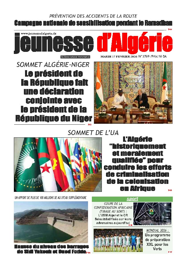AlgérieSommet de l’UA : Allocution du président de la République concernant l’étude relative aux répercussions de la qualification du colonialisme comme crime contre l’humanité AlgérieReprésentant le président de la République, le Premier ministre participe à Addis-Abeba à une séance sur le G20 AlgérieLe président de la République préside un Conseil des ministres : le secteur de l’eau et les préparatifs pour le mois sacré au menu AlgérieL’Algérie est capable de former une génération diplomatique consciente et qualifiée À LA UNE Sommet de l’UA : Allocution du président de la République concernant l’étude relative aux répercussions de la qualification du colonialisme comme crime contre l’humanité février 15, 2026 Représentant le président de la République, le Premier ministre participe à Addis-Abeba à une séance sur le G20 février 15, 2026 Le président de la République préside un Conseil des ministres : le secteur de l’eau et les préparatifs pour le mois sacré au menu février 10, 2026 L’Algérie est capable de former une génération diplomatique consciente et qualifiée février 7, 2026 Algérie Sommet de l’UA : Allocution du président de la République concernant l’étude relative aux répercussions de la qualification du colonialisme comme crime contre l’humanité février 15, 2026 Représentant le président de la République, le Premier ministre participe à Addis-Abeba à une séance sur le G20 février 15, 2026 Massacre de Sakiet Sidi Youssef, sombre illustration de la politique d’extermination pratiquée par la France coloniale février 11, 2026 Le Conseil de la nation approuve les listes de ses représentants dans les deux commissions paritaires février 11, 2026 LatestPopular Sommet de l’UA : Allocution du président de la République concernant l’étude relative aux répercussions de la qualification du colonialisme comme crime contre l’humanité février 15, 2026 Représentant le président de la République, le Premier ministre participe à Addis-Abeba à une séance sur le G20 février 15, 2026 Massacre de Sakiet Sidi Youssef, sombre illustration de la politique d’extermination pratiquée par la France coloniale février 11, 2026 Le Conseil de la nation approuve les listes de ses représentants dans les deux commissions paritaires février 11, 2026 Sommet de l’UA : Allocution du président de la République concernant l’étude relative aux répercussions de la qualification du colonialisme comme crime contre l’humanité février 15, 2026 M. Attaf représente le président de la République aux travaux de la 34e session ordinaire du Sommet de la Ligue arabe et de la 5e session du Sommet arabe du développement mai 15, 2025 Boumerdes : Le ministre de l’Industrie inaugure la raffinerie de sucre « Tafadis » à Larbatache mai 15, 2025 Sanctions : l’USM Alger écope d’un match à huis clos mai 15, 2025 Sports sportsMondial 2027 :19 pays dont l’Algérie ont décroché leur billet pour le rendez-vous allemandadmin février 5, 2026 sportsLigue 1: L’O. Akbou et le CS Constantine nouveaux dauphinsadmin février 4, 2026 sportsSéminaire à Oran pour les arbitres d’élite A admin janvier 27, 2026 sportsCAN 2026 : défaite de l’Algérie face à l’Egypte (42-28)admin janvier 25, 2026 Economie Conventions BNA-FGAR pour la garantie des crédits d’exploitation janvier 20, 2026 L’alimentation des comptes commerciaux par les moyens de paiement scripturaux ou par versement d’espèces autorisée janvier 5, 2026 L’importation de voitures de moins de 3 ans réservée exclusivement aux citoyens, et non aux entreprises novembre 25, 2025 Lancement de l’exploitation du minerai de fer de Gara Djebilet le 1er trimestre de 2026 novembre 16, 2025