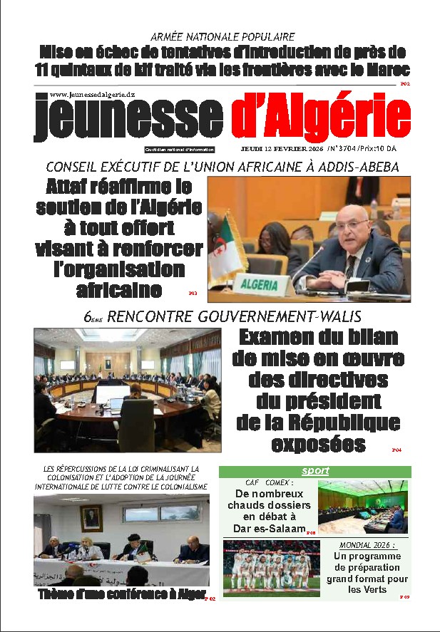 AlgérieLe président de la République préside un Conseil des ministres : le secteur de l’eau et les préparatifs pour le mois sacré au menu AlgérieL’Algérie est capable de former une génération diplomatique consciente et qualifiée AlgérieReboisement : grande campagne le 14 février pour la plantation de cinq millions d’arbres sportsMondial 2027 :19 pays dont l’Algérie ont décroché leur billet pour le rendez-vous allemand À LA UNE Le président de la République préside un Conseil des ministres : le secteur de l’eau et les préparatifs pour le mois sacré au menu février 10, 2026 L’Algérie est capable de former une génération diplomatique consciente et qualifiée février 7, 2026 Reboisement : grande campagne le 14 février pour la plantation de cinq millions d’arbres février 6, 2026 Mondial 2027 :19 pays dont l’Algérie ont décroché leur billet pour le rendez-vous allemand février 5, 2026 Algérie Massacre de Sakiet Sidi Youssef, sombre illustration de la politique d’extermination pratiquée par la France coloniale février 11, 2026 Le Conseil de la nation approuve les listes de ses représentants dans les deux commissions paritaires février 11, 2026 Le président de la République préside un Conseil des ministres : le secteur de l’eau et les préparatifs pour le mois sacré au menu février 10, 2026 L’Algérie est capable de former une génération diplomatique consciente et qualifiée février 7, 2026 LatestPopular Massacre de Sakiet Sidi Youssef, sombre illustration de la politique d’extermination pratiquée par la France coloniale février 11, 2026 Le Conseil de la nation approuve les listes de ses représentants dans les deux commissions paritaires février 11, 2026 Le président de la République préside un Conseil des ministres : le secteur de l’eau et les préparatifs pour le mois sacré au menu février 10, 2026 L’Algérie est capable de former une génération diplomatique consciente et qualifiée février 7, 2026 Massacre de Sakiet Sidi Youssef, sombre illustration de la politique d’extermination pratiquée par la France coloniale février 11, 2026 M. Attaf représente le président de la République aux travaux de la 34e session ordinaire du Sommet de la Ligue arabe et de la 5e session du Sommet arabe du développement mai 15, 2025 Boumerdes : Le ministre de l’Industrie inaugure la raffinerie de sucre « Tafadis » à Larbatache mai 15, 2025 Sanctions : l’USM Alger écope d’un match à huis clos mai 15, 2025 Sports sportsMondial 2027 :19 pays dont l’Algérie ont décroché leur billet pour le rendez-vous allemandadmin février 5, 2026 sportsLigue 1: L’O. Akbou et le CS Constantine nouveaux dauphinsadmin février 4, 2026 sportsSéminaire à Oran pour les arbitres d’élite A admin janvier 27, 2026 sportsCAN 2026 : défaite de l’Algérie face à l’Egypte (42-28)admin janvier 25, 2026 Economie Conventions BNA-FGAR pour la garantie des crédits d’exploitation janvier 20, 2026 L’alimentation des comptes commerciaux par les moyens de paiement scripturaux ou par versement d’espèces autorisée janvier 5, 2026 L’importation de voitures de moins de 3 ans réservée exclusivement aux citoyens, et non aux entreprises novembre 25, 2025 Lancement de l’exploitation du minerai de fer de Gara Djebilet le 1er trimestre de 2026 novembre 16, 2025